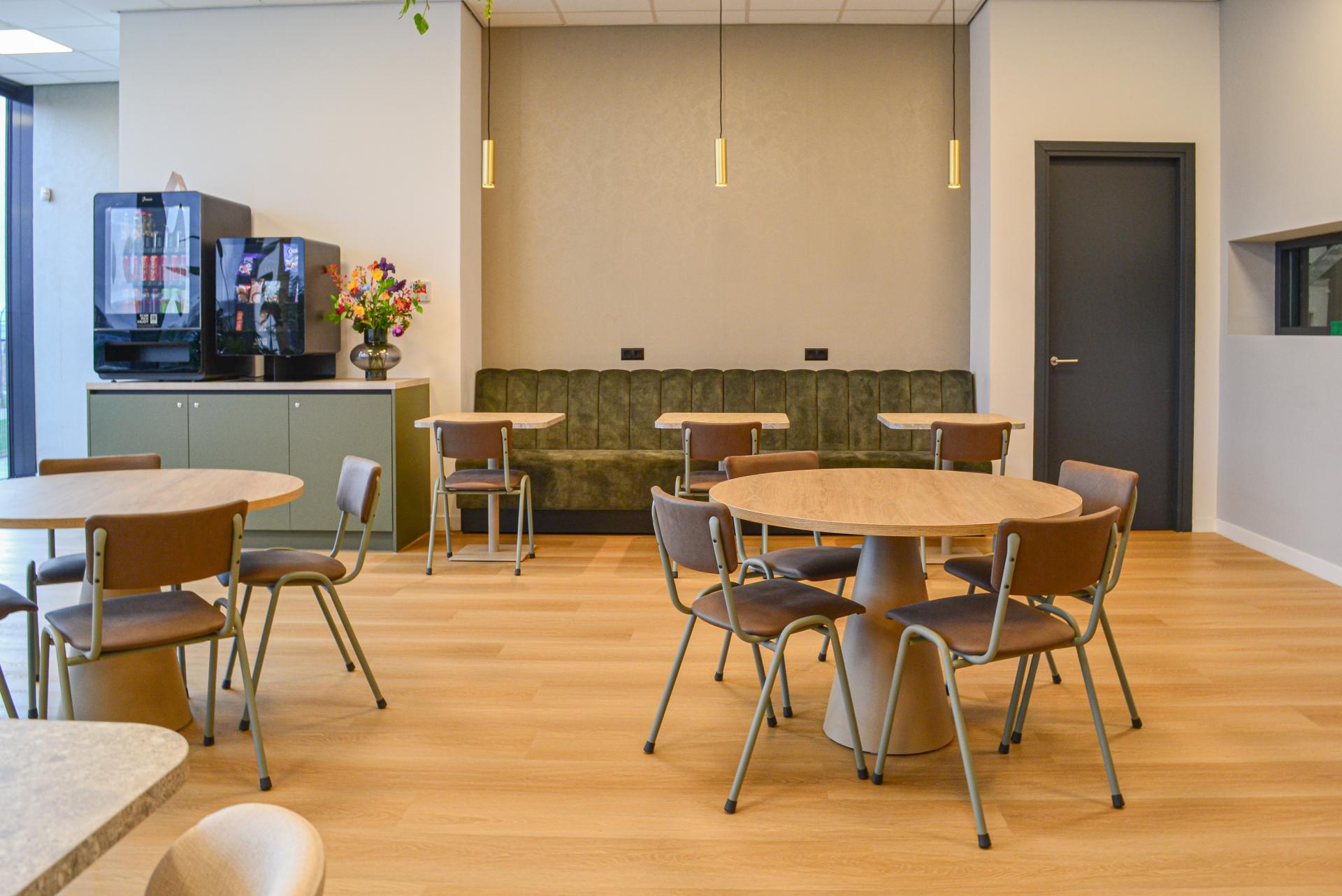 Voorin de kantine staan ronde tafels met Ikon kegelonderstel, gecombineerd met Thomas stoelen in taupe. Hier kunnen collega’s met elkaar in gesprek gaan of genieten van hun pauzemoment. Groene accenten |