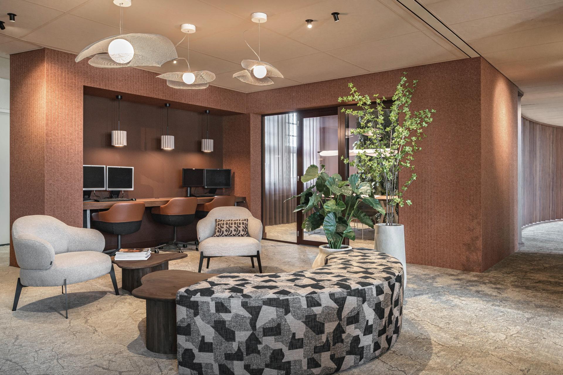 Bij binnenkomst wordt de toon direct gezet. De op maat gemaakte poef trekt subtiel de aandacht en vormt het hart van de entree. De combinatie van grijze en zwarte tinten contrasteert stijlvol met de terracotta muren, terwijl de ronde vormen zorgen voor zachtheid en balans in de ruimte. Samen met de Rouen-fauteuils en de bijzettafels ontstaat een setting die zowel representatief als uitnodigend is. Bezoekers voelen zich direct welkom, terwijl medewerkers een prettige plek hebben om kort te overleggen of informeel samen te komen.