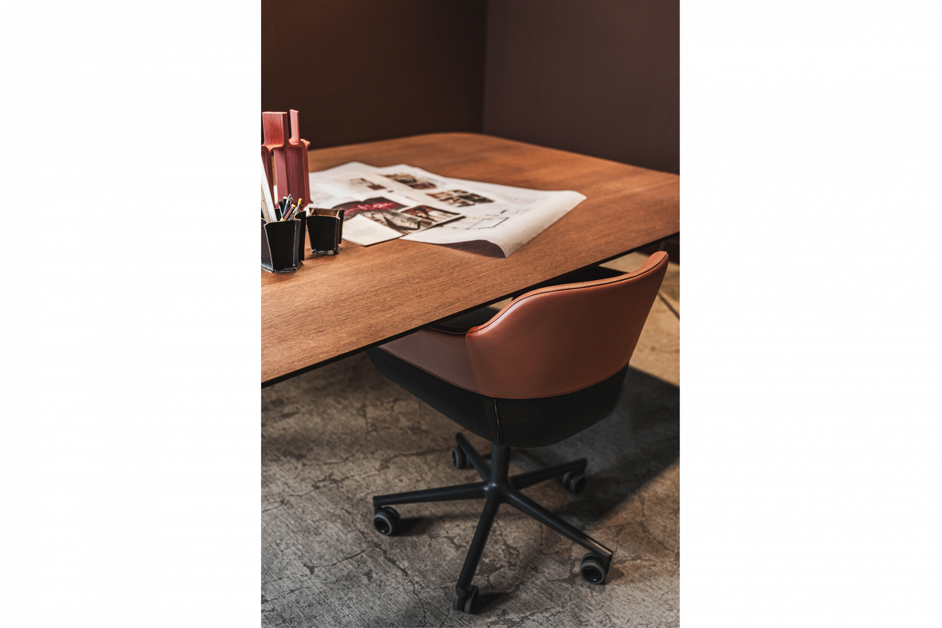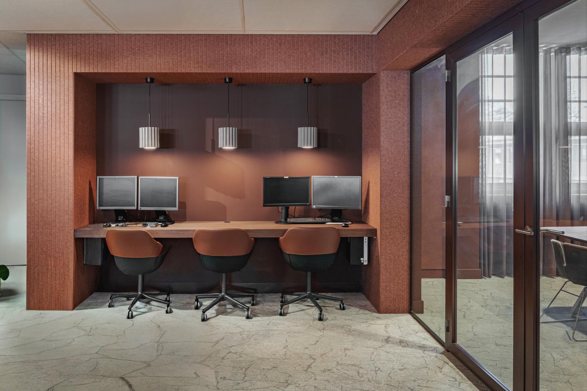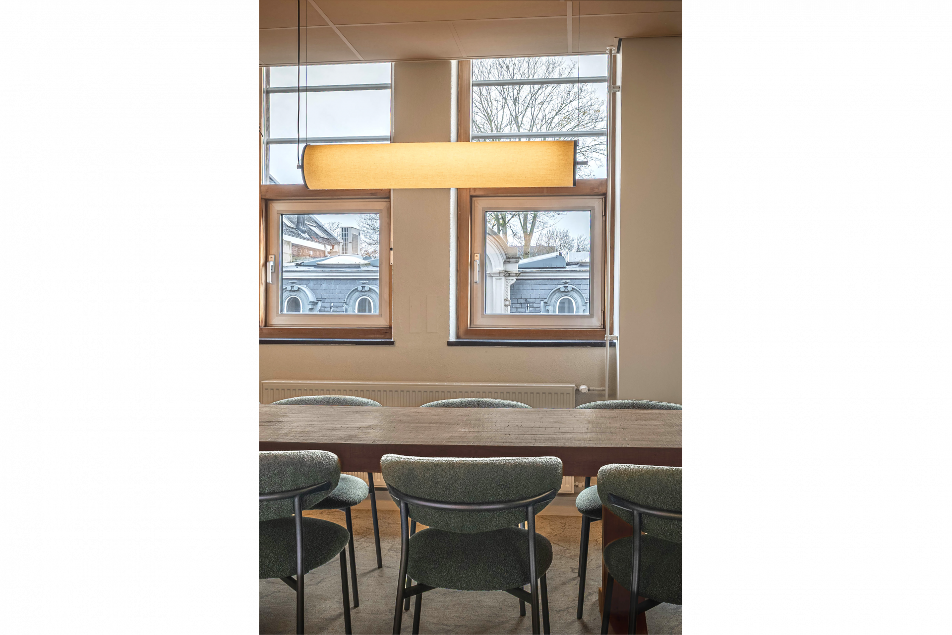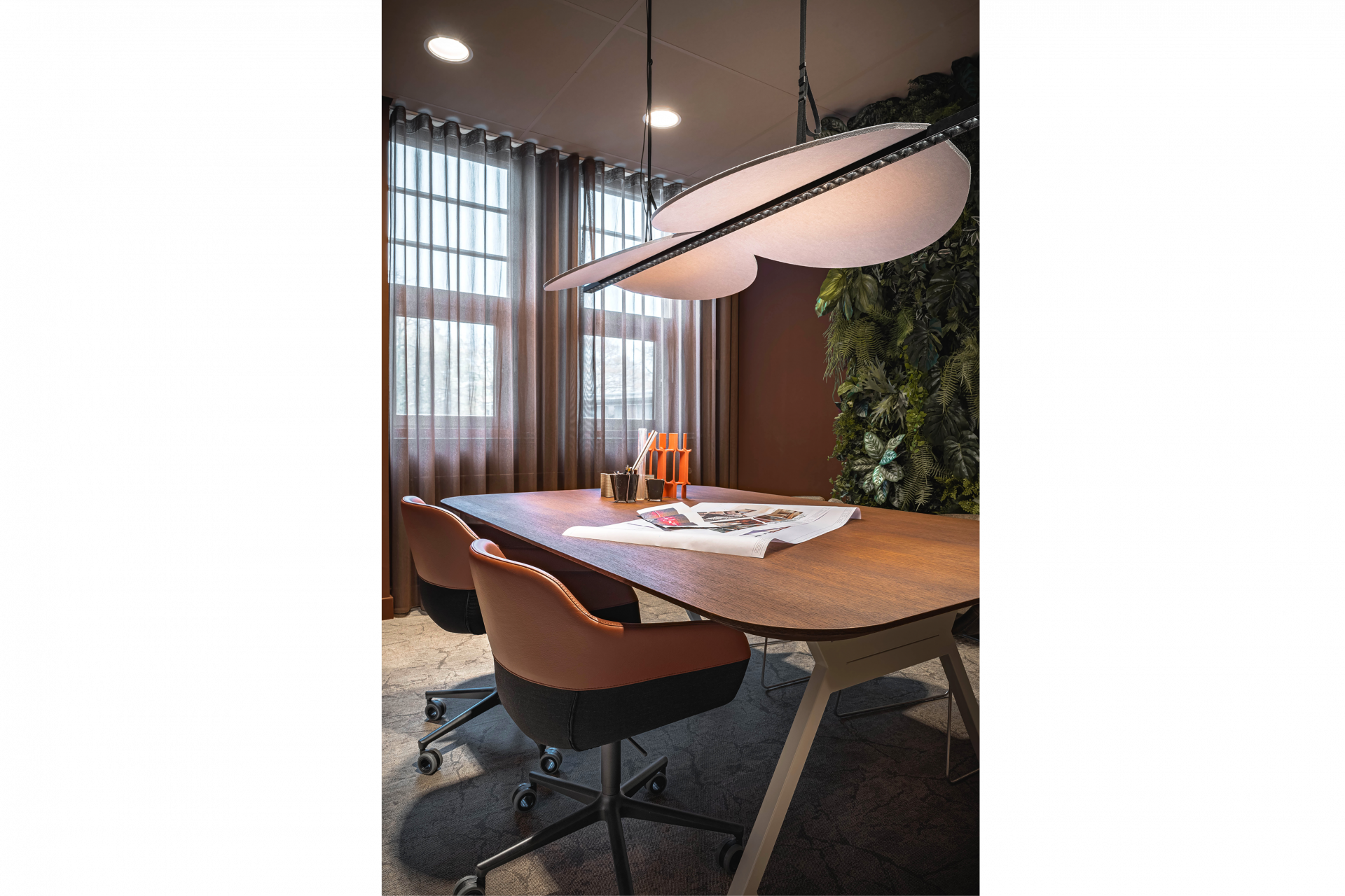 Verder in het kantoor bevinden zich de werk- en vergaderruimtes, waar rust en concentratie centraal staan. De Crona-stoelen met spinpoot sluiten naadloos aan bij de moderne uitstraling van het interieur. De combinatie van leer aan de bovenzijde en stof aan de onderzijde zorgt voor een subtiel contrast in materiaalgebruik en geeft de ruimte een verfijnde, chique uitstraling, zonder in te leveren op comfort. De stoelen ondersteunen een actieve zithouding en dragen bij aan een prettige werksfeer, of het nu gaat om een creatieve brainstorm of een strategisch overleg.