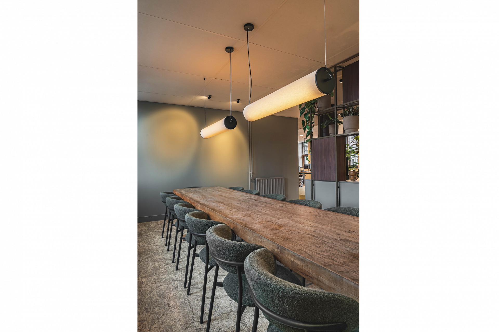 Ook de kantine draagt bij aan de totaalbeleving van het kantoor. De groene Durban-stoelen vormen een harmonieus geheel met de groene muur en de houten tafel. De natuurlijke kleuren en materialen brengen warmte in de ruimte en zorgen voor een ontspannen sfeer. Samen vormen deze elementen een organisch geheel, waarin medewerkers in een informele setting kunnen samenkomen, lunchen en overleggen.