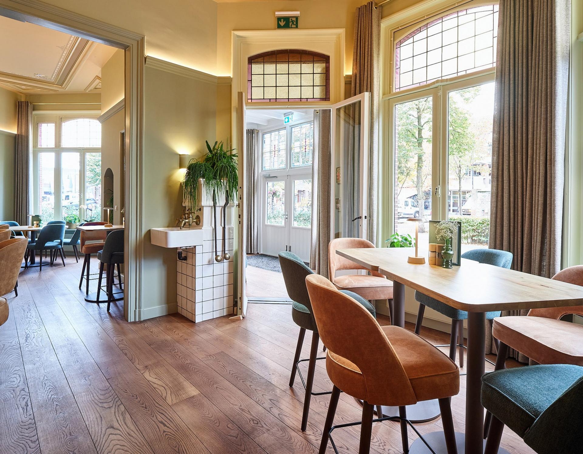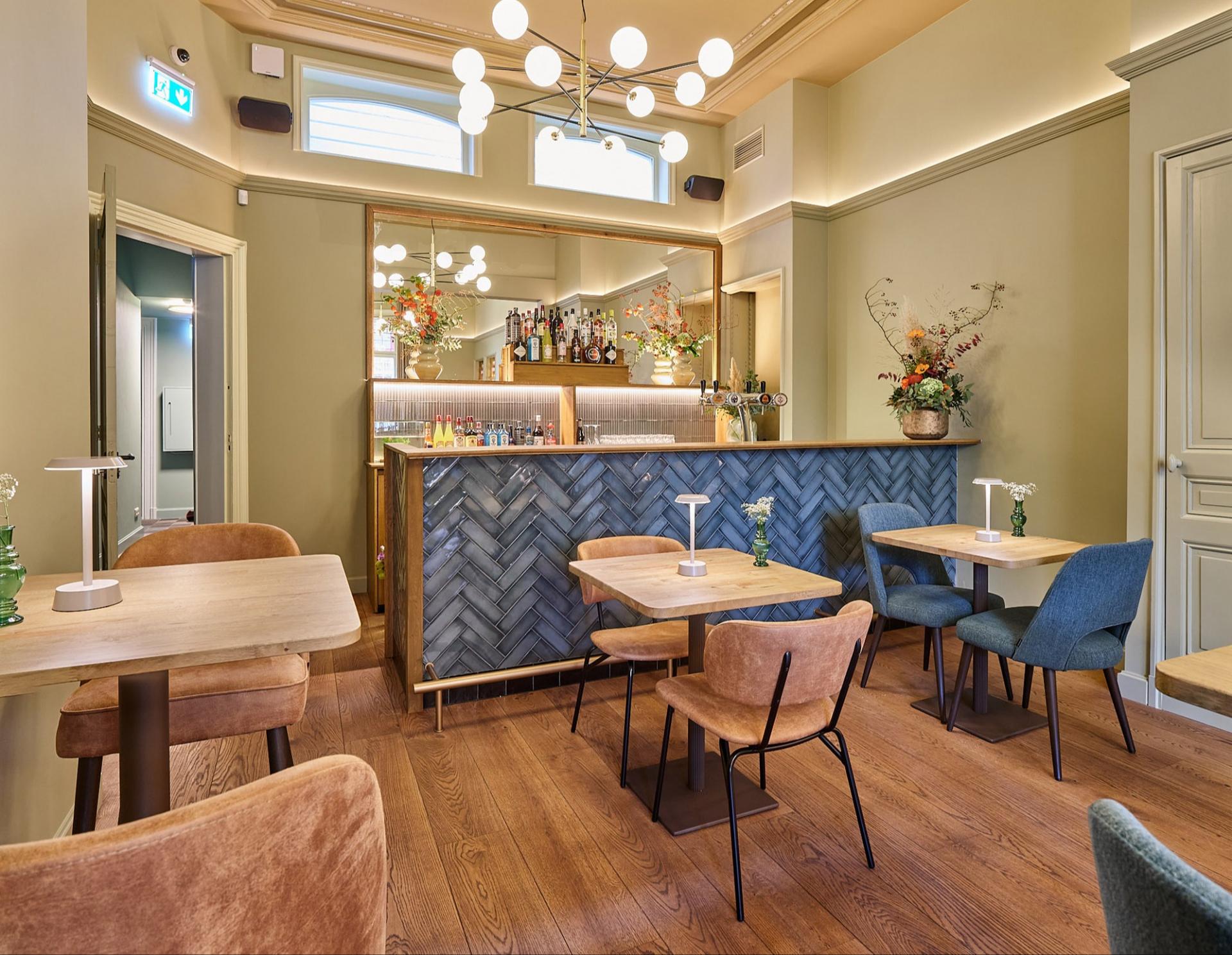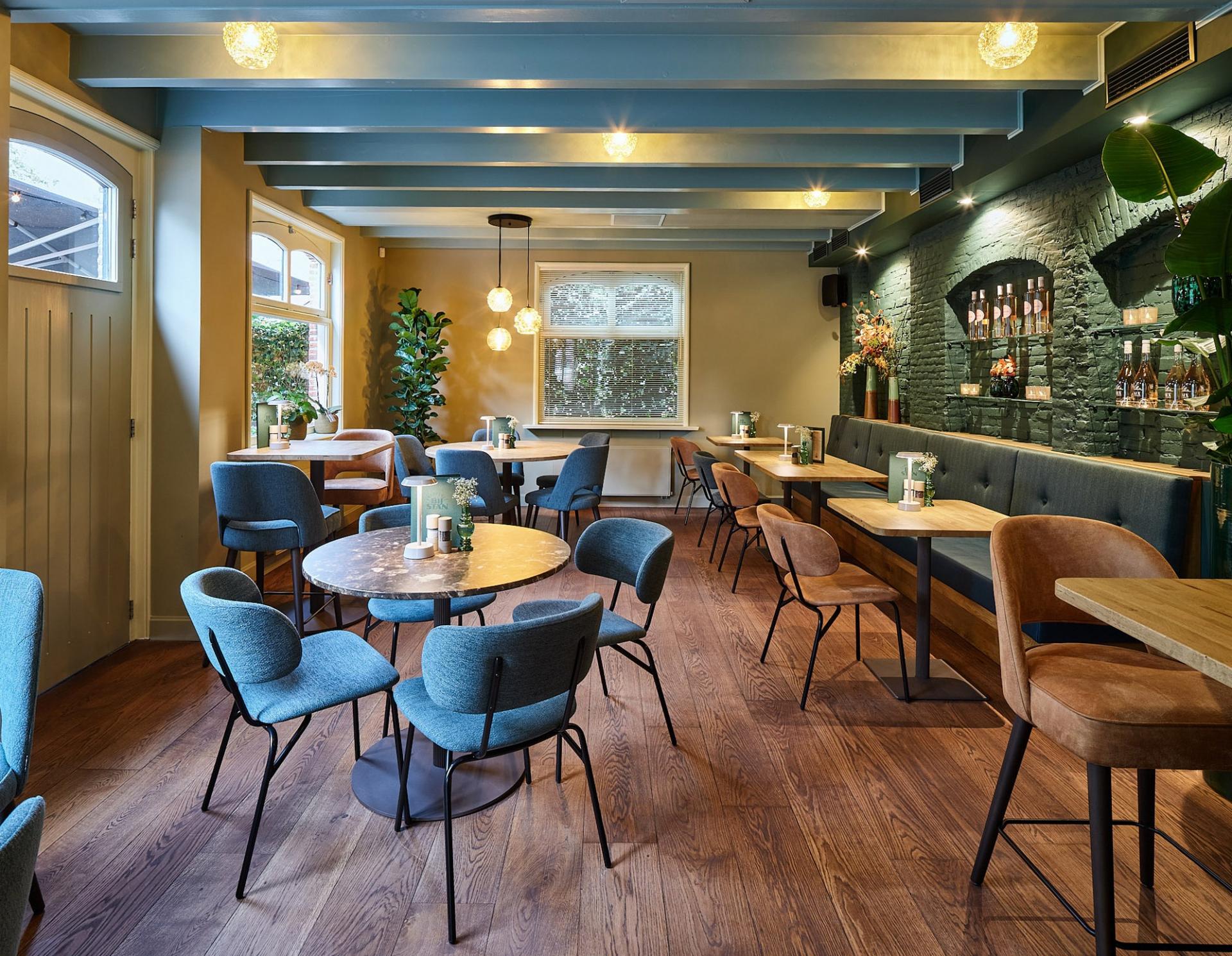 Aan de linkerzijde ligt de achterkamer, die zich onderscheidt door een groene accentmuur en plafond. Hier creëren Inox-tafels in combinatie met Germain-stoelen in blauwe en terracotta stoffering een warme, eigentijdse sfeer.