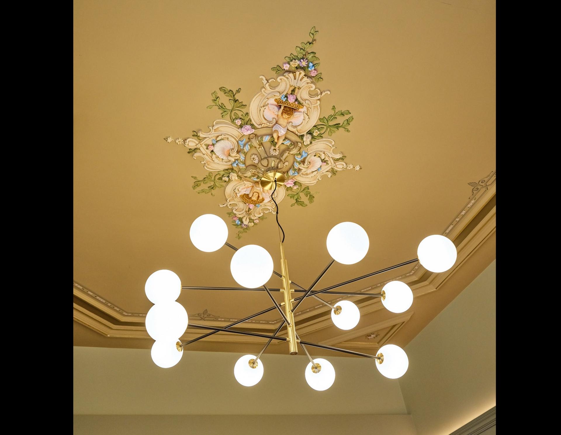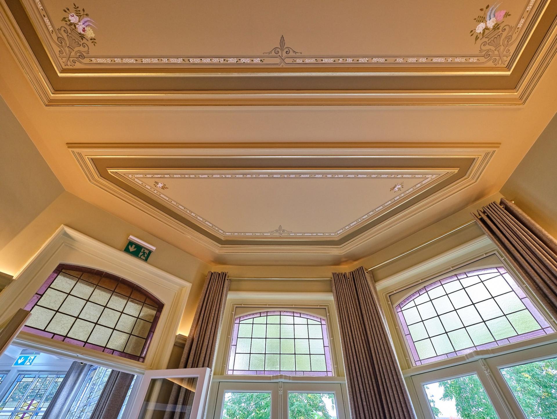 Het pand, gebouwd in 1890, heeft een monumentale status. Tijdens de verbouwing is er aandacht besteed aan de originele elementen: het glas-in-lood, de klassieke plafonddetails, de fontein bij de ingang en de openhaard zijn behouden gebleven. Het samenspel van historische en moderne elementen creëert een warme, uitnodigende sfeer voor gasten. Met ons meubilair hebben wij een bijdrage kunnen leveren aan deze bijzondere balans van oude- en nieuwe elementen.