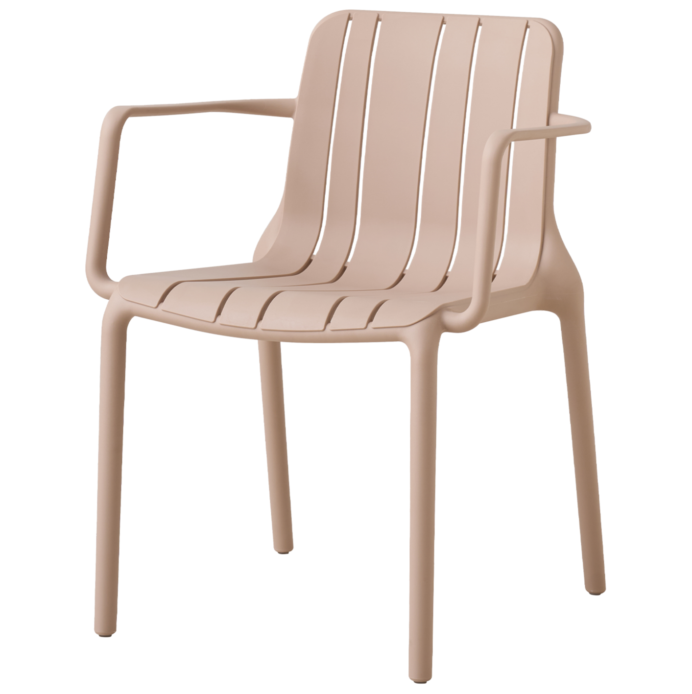 De Drift A zand is een comfortabele en onderhoudsvriendelijke terrasstoel. De licht gebogen zitting en rugleuning zorgen voor een aangename zit, terwijl de armleuningen extra steun bieden.