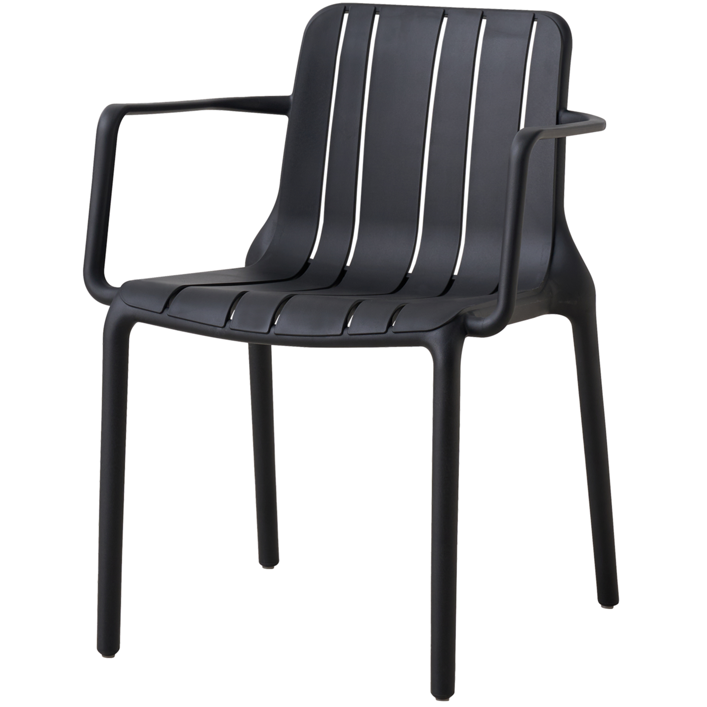 De Drift A zwart is een comfortabele en onderhoudsvriendelijke terrasstoel. De licht gebogen zitting en rugleuning zorgen voor een aangename zit, terwijl de armleuningen extra steun bieden.