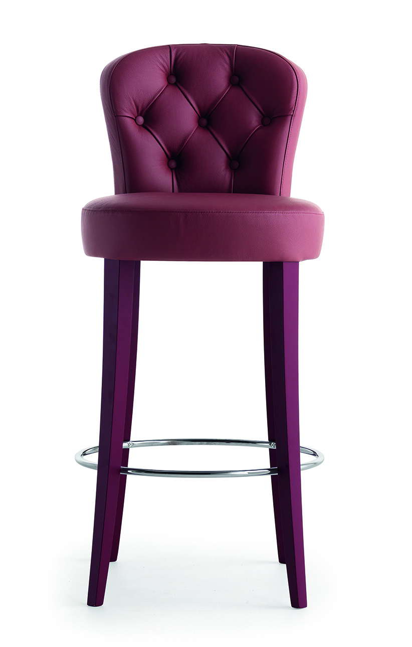 De Euforia barkruk heeft een massief houten frame en een volledig gestoffeerde zitting en rugleuning. De voorzijde van de rug heeft een gecapitonneerde bekleding. De voetsteun is gemaakt van chroom, zonder knoopdetail maar met ritsdetail.