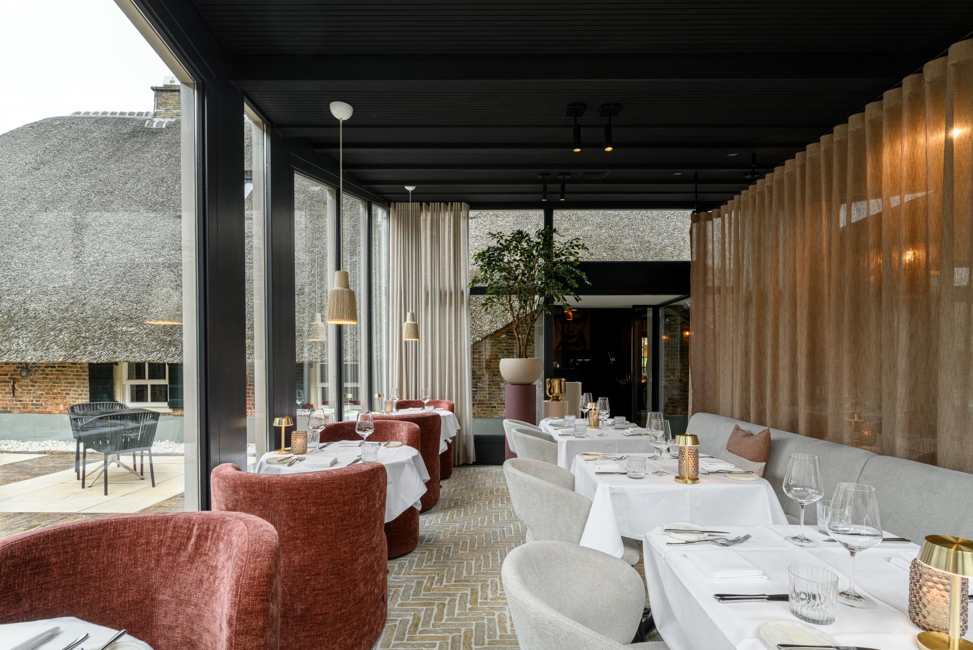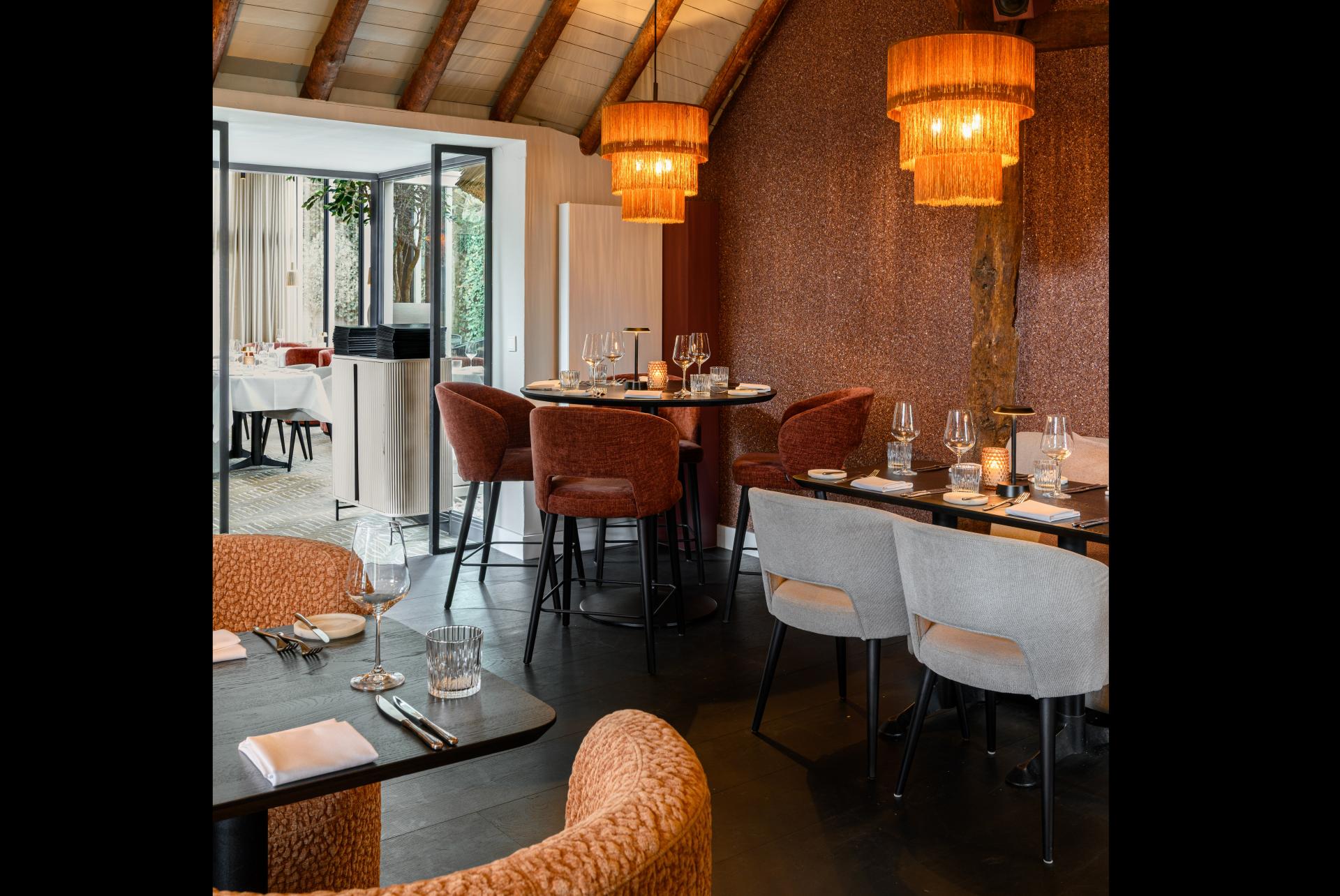 Als je vanuit de bar doorloopt naar de oranjerie merk je direct dat de sfeer verandert. Het natuurlijke licht valt hier mooi naar binnen door de grote raampartijen, waardoor de ruimte een open uitstraling heeft. De stenen vloer en de rode Montreal-fauteuils vormen een stijlvol contrast en sluiten mooi aan bij de andere meubels in de ruimte. Historie en een modern comfort |