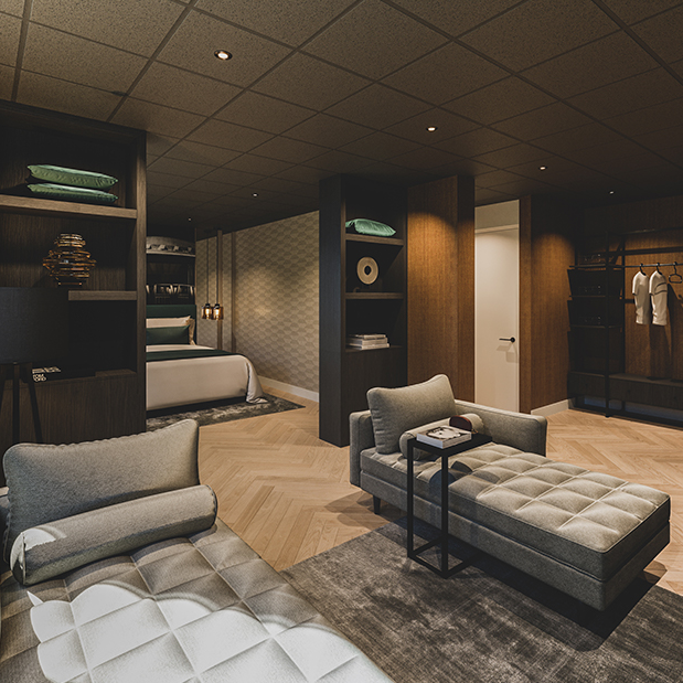 Een tweedeling die wij, door onze ruime ervaring in de interieursector, maar al te goed begrijpen. Wij willen suites ontwerpen die ervoor zorgen dat gasten eigenlijk niet meer weg willen. Voor dit project hebben we drie kamers ontworpen met verschillende doeleinden. Voor de comfort suite is gekozen voor lichte kleuren met groene kleuraccenten, zo blijft de suite ruim ogen. Er is een multifunctioneel meubel ontworpen waar een bureau in is geïntegreerd, een koffiezetapparaat en waar kleding kan worden opgeborgen.